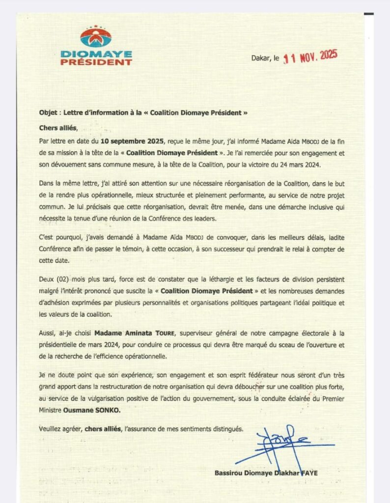 Dans sa lettre d’information, datée du 11 novembre 2025, le Président Bassirou Diomaye Diakhar Faye rappelle qu’il avait informé Mme Aïda Mbodj, dès le 10 septembre 2025, de la fin de sa mission à la tête de la Coalition Diomaye Président. Il remercie la patronne de la DER/FJ pour son engagement et son « dévouement sans commune mesure » pour la victoire de mars 2024.