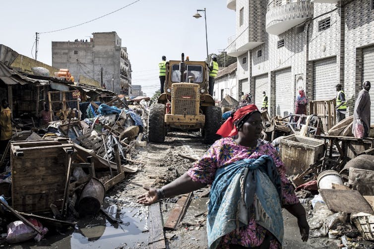 Une femme proteste alors qu’un bulldozer déblaie les étals d’un marché informel avant la désinfection du quartier populaire de la Médina à Dakar, le 22 mars 2020. John Wessels/afp